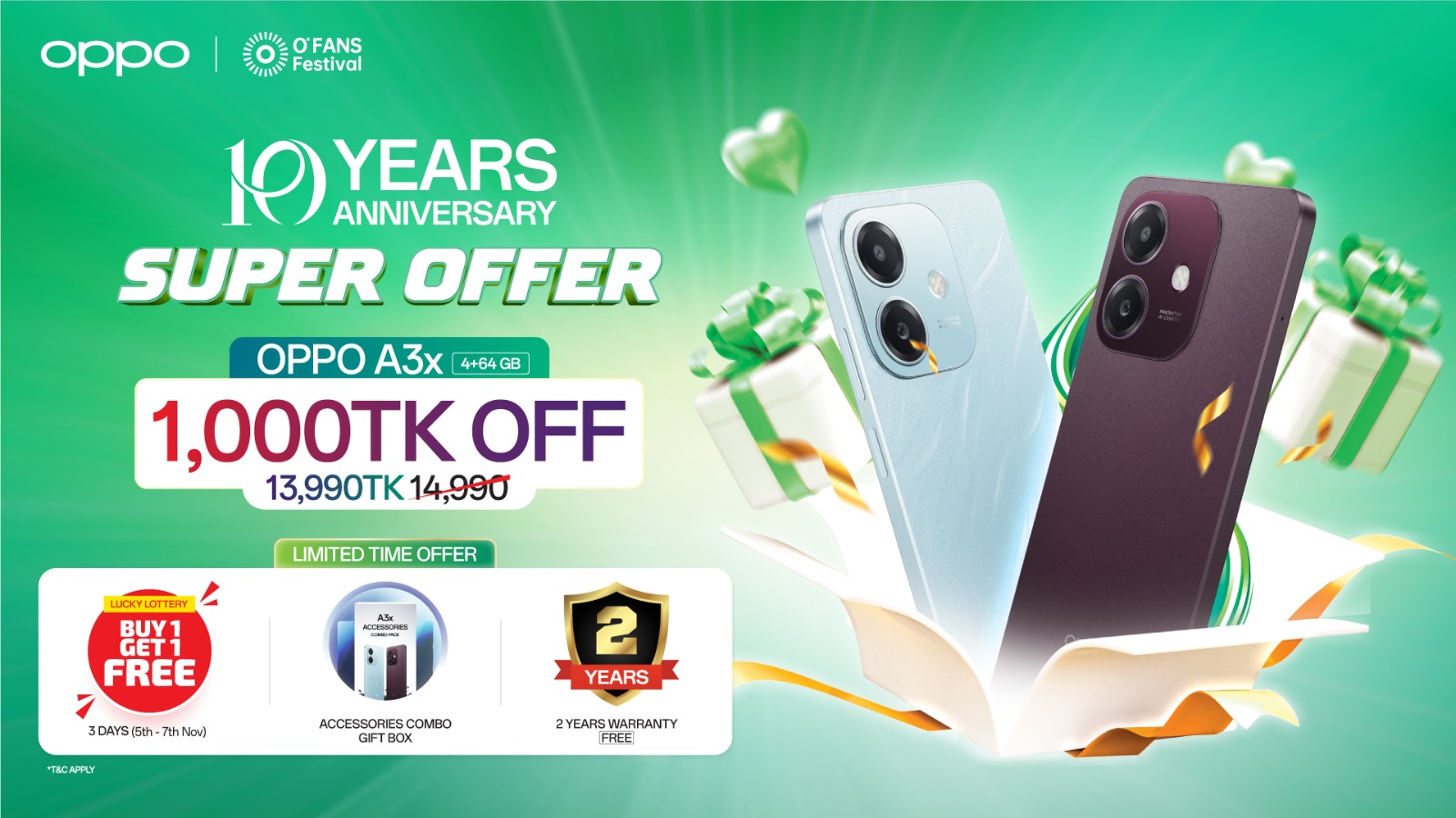 ঢাকা,ডিসেম্বর,২৪ অপো ফ্যানস ফেস্টিভ্যালের অংশ হিসেবে ও বাংলাদেশে অপো’র ১০ম প্রতিষ্ঠাবার্ষিকী উদযাপন উপলক্ষে গ্রাহকদের জন্য এসেছে দারুণ সব অফার। ‘ডিউরেবিলিটি চ্যাম্পিয়ন’ স্মার্টফোন অপো এ৩এক্স-এর সাথে থাকছে এই অনন্য সুযোগ।