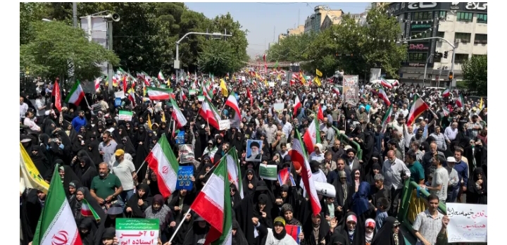 সাপ্তাহিক জুমার নামাজের পর ইরানের রাজধানী তেহরানে ইসরায়েলের বিরুদ্ধে হাজার হাজার মানুষ বিক্ষো করেছেন। এ সময় বিক্ষোভকারীদের ইরানের ক্ষমতাসীন সরকার ও নেতাদের সমর্থনে বিভিন্ন ধরনের স্লোগান দিতে দেখা যায়। আজ ২০ জুন,শুক্রবার ইরানের রাষ্ট্রীয় টেলিভিশনের খবরে এই তথ্য জানানো হয়েছে।