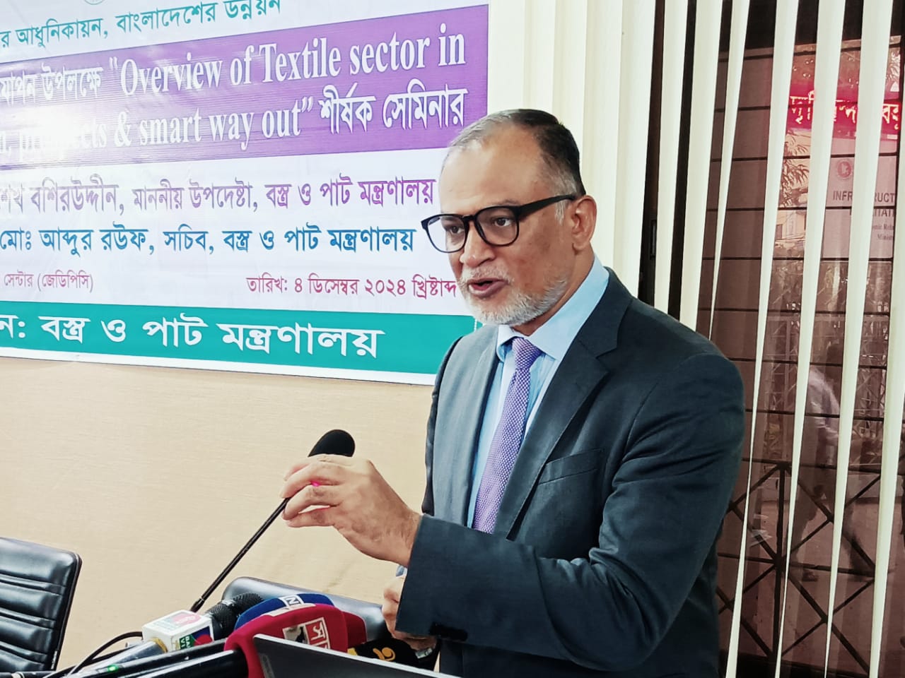 বুধবার (৪ ডিসেম্বর) ফার্মগেটের জুট ডাইভারসিফিকেশন প্রমোশন সেন্টার (জেডিপিসি)র সম্মেলন কক্ষে ‘ বস্ত্র শিল্পের আধুনিকায়ন, বাংলাদেশের উন্নয়ন’ প্রতিপাদ্যে বস্ত্র ও পাট মন্ত্রণালয় আয়োজিত ‘জাতীয় বস্ত্র দিবস ২০২৪’ উদযাপন উপলক্ষে ‘Overview of textile sector in Bangladesh : Problems, Prospects and Smart way out ‘ শীর্ষক সেমিনারে প্রধান অতিথির বক্তব্যে তিনি এসব কথা বলেন।