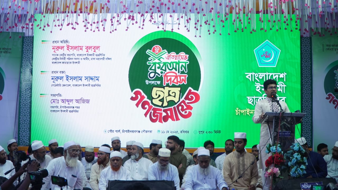 বাংলাদেশ ইসলামী ছাত্রশিবির, চাঁপাইনবাবগঞ্জ জেলা শাখার উদ্যোগে ঐতিহাসিক ১১ মে ‘কোরআন দিবস’ উপলক্ষে ছাত্রগণজমায়েত অনুষ্ঠিত হয়েছে। আজ (১১ মে) রোববার দুপুর ২টা ৩০ মিনিটে চাঁপাইনবাবগঞ্জ পৌর পার্কে এ গণজমায়েত অনুষ্ঠিত হয়। এতে সভাপতিত্ব করেন শহর ছাত্রশিবিরের সভাপতি আব্দুল আজিজ এবং সঞ্চালনা করেন সেক্রেটারি ইউসুফ আল গালিব।