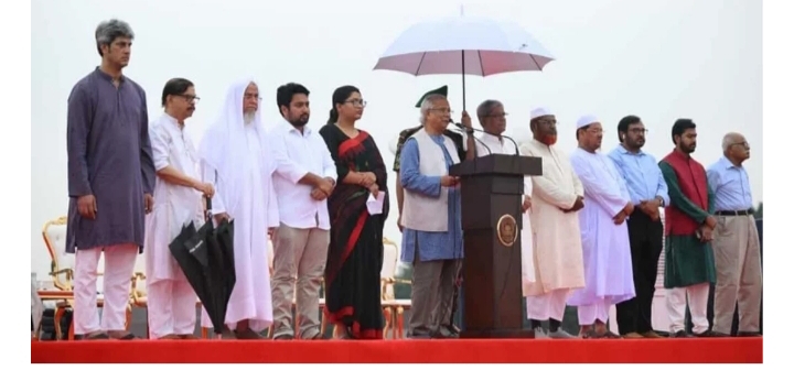 ঘোষণাপত্র পাঠ করে ড. ইউনূস বলেন, “২০২৪ সালের ৫ আগস্ট গণঅভ্যুত্থানে বিজয়ী বাংলাদেশের জনগণের আকাঙ্ক্ষার প্রতিফলন হিসেবে এই ঘোষণাপত্র প্রণয়ন করা হয়েছে।