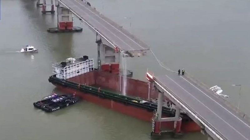 রাষ্ট্রনিয়ন্ত্রিত সম্প্রচারমাধ্যম সিসিটিভির এক ছবিতে দেখা যাচ্ছে, সেতুর একটি অংশ ভেঙে গেছে। এর নিচে জাহাজটি আটকা পড়ে আছে।