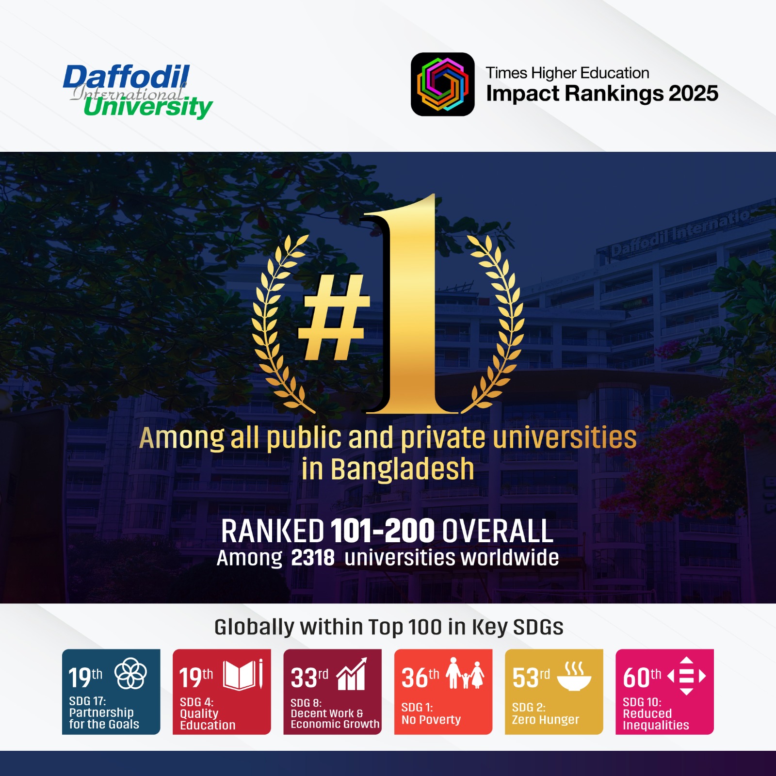 বিশ্ববিদ্যালয়ের মধ্যে স্থান পেয়েছে ড্যাফোডিল ইন্টারন্যাশনাল ইউনিভার্সিটি। বিশ্বব্যাপী ২৩১৮টি বিশ্ববিদ্যালয়ের মধ্যে ১০১ থেকে ২০০ এর মধ্যে একটি মর্যাদাপূর্ণ অবস্থান অর্জন করেছে ড্যাফোডিল বিশ্ববিদ্যালয় এবং বাংলাদেশ থেকে র্যাঙ্ক করা ১৯ টি পাবলিক এবং প্রাইভেট বিশ্ববিদ্যালয়ের মধ্যে ড্যাফোডিল ইন্টারন্যাশনাল ইউনিভার্সিটি (ডিআইইউ) প্রথম স্থানে রয়েছে। ইমপ্যাক্ট র্যাঙ্কিং অংশগ্রহণকারী বিশ্ববিদ্যালয়গুলোর দ্বারা অর্জিত জাতিসংঘের টেকসই উন্নয়ন লক্ষ্যগুলির অর্জন পরিমাপ করে এবং সেই অনুযায়ী র্যাঙ্কিং করা হয়।