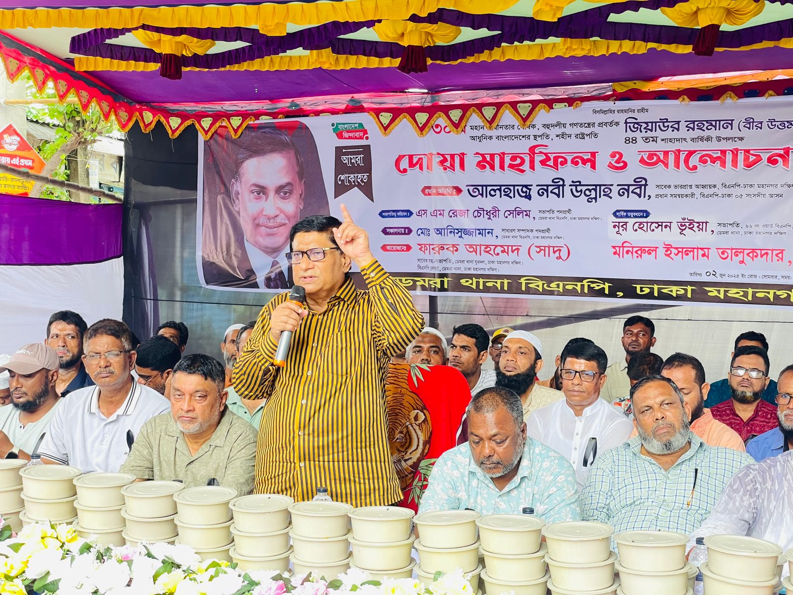 শহীদ রাষ্ট্রপতি জিয়াউর রহমানের ৪৪তম শাহাদাত বার্ষিকী উপলক্ষে সোমবার বিকেলে ডেমরা থানা বিএনপির উদ্যোগে আয়োজিত দোয়া ও আলোচনা সভায় প্রধান অতিথির বক্তব্যে নবীউল্লাহ নবী এসব কথা বলেন।
