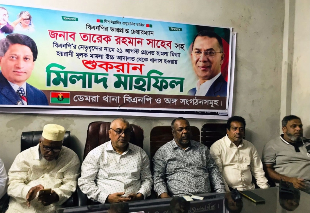 তারেক রহমানসহ বিএনপির নেতৃবৃন্দের নামে ২১ আগস্ট গ্রেনেড হামলা মিথ্যা ও হয়রানিমূলক মামলা উচ্চ আদালত থেকে খালাস হওয়ায় ডেমরায় শুকরান মিলাদ মাহফিল অনুষ্ঠিত হয়েছে। সারুলিয়ায় অবস্থিত ডেমরা থানা বিএনপির প্রধান কার্যালয়ে রোববার রাতে বিএনপি ও অঙ্গ সংগঠনের উদ্যোগে এ দোয়ার অনুষ্ঠান হয়।