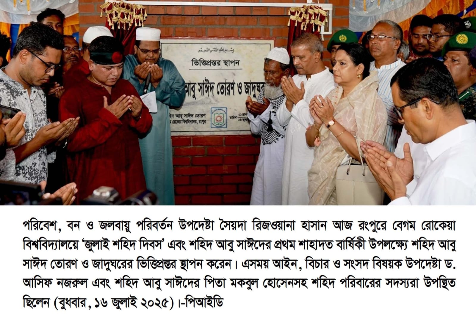 এর আগে উপদেষ্টা সৈয়দা রিজওয়ানা হাসান অন্যান্য অতিথিদের সঙ্গে শহিদ আবু সাঈদ তোরণ ও জাদুঘর, স্ট্রিট মেমোরি স্ট্যাম্প এবং স্মৃতিস্তম্ভের ভিত্তিপ্রস্তর স্থাপন করেন ও আলোকচিত্র প্রদর্শনী পরিদর্শন করেন।