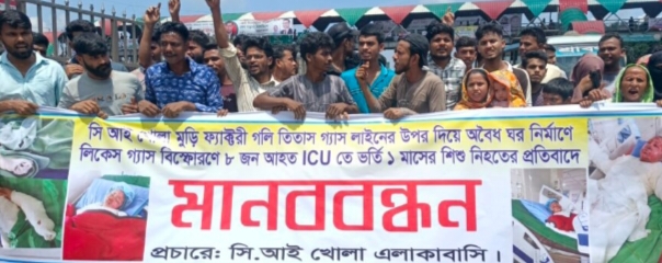 নারায়ণগঞ্জের সিদ্ধিরগঞ্জের পূর্ব পাইনাদি এলাকায় জাকির খন্দকার ভিলা নামের বাড়িতে তিতাস গ্যাস লাইনের লিকেজ থেকে বিস্ফোরণে একই বাড়ির দুটি পরিবারের ০৯ জন অগ্নিদগ্ধের ঘটনাকে বিদ্যুতের শর্টসার্কিট থেকে ফ্রিজের কম্প্রেসার বিস্ফোরণের কারণে দুর্ঘটনা আখ্যা দেয়া জেলা প্রশাসনের কর্মকর্তাদের কেউ ঘটনাস্থল পরিদর্শন না করা এবং দগ্ধদের সরকারীভাবে সুচিকিৎসার ব্যবস্থা না করার প্রতিবাদে দগ্ধদের স্বজন ও এলাকাবাসী মানববন্ধন ও সড়ক অবরোধ করেছে।