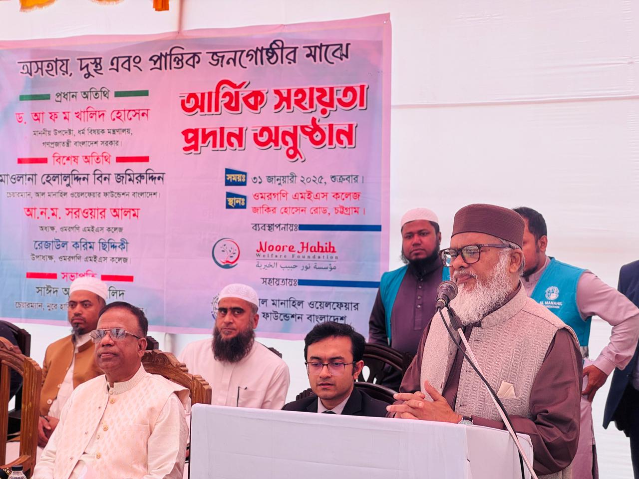 আজ (৩১ জানুয়ারি) সকালে চট্টগ্রামে ওমর গণি এমইএস কলেজ মাঠে অসহায়, দুস্থ ও প্রান্তিক জনগোষ্ঠীর মাঝে আর্থিক সহায়তা প্রদান অনুষ্ঠানে প্রধান অতিথির বক্তৃতায় তিনি এসব কথা বলেন।আল মানাহিল ফাউন্ডেশনের সহায়তায় নুরে হাবিব