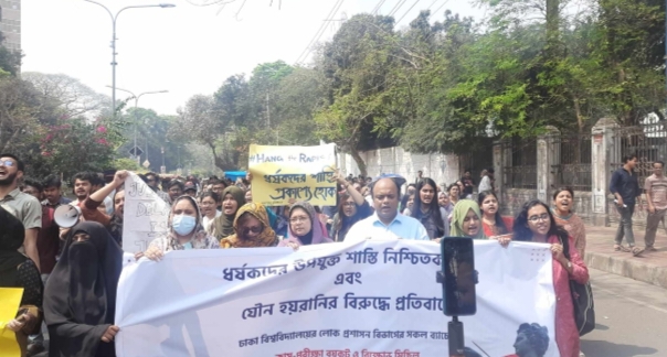 দেশে চলমান লাগাতার ধর্ষণ ও নারী নিপীড়নের ঘটনায় ধর্ষকদের উপযুক্ত শাস্তি নিশ্চিতকরণ এবং দেশব্যাপী যৌন হয়রানির বিরুদ্ধে ক্লাস বর্জনের ঘোষণাদিয়েছে ঢাকা বিশ্ববিদ্যালয়ের লোক প্রশাসন বিভাগের শিক্ষার্থীরা। একই সঙ্গে ধর্ষকদের সর্বোচ্চ শান্তি মৃত্যুদণ্ড কার্যকরের দাবিতে বিক্ষোভ মিছিল করেছে বিভাগটির শিক্ষার্থীরা।