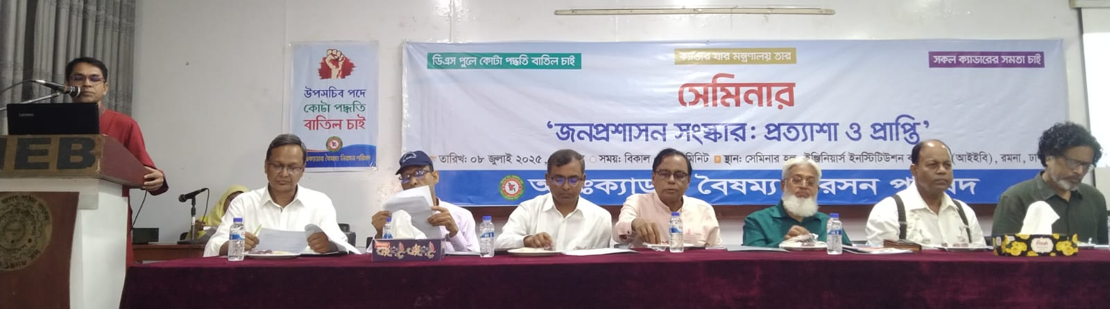 আন্তঃক্যাডার বৈষম্য নিরসন পরিষদের উদ্যোগে ‘জনপ্রশাসন সংস্কারঃ প্রত্যাশা ও প্রাপ্তি’ শীর্ষক একটি সেমিনার আজ রাজধানীর রমনাস্থ ইঞ্জিনিয়ার্স ইন্সটিটিউশন, বাংলাদেশ (আইইবি) এর সেমিনার হলে অনুষ্ঠিত হয়।
