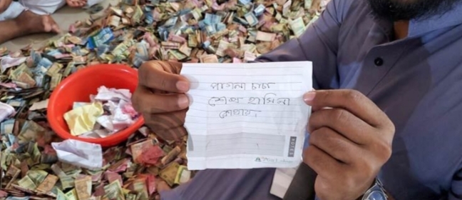 পাগলা মসজিদের দানবাক্সে টাকার সঙ্গেমনোবাসনা পূরণের আকাঙ্ক্ষার বেশ কিছু চিঠি ও চিরকুট পাওয়া গেছে। এর মধ্যে একটি চিরকুট সামাজিক যোগাযোগ মাধ্যমে ভাইরাল হয়েছে। বেনামি ওই চিরকুটে লেখা রয়েছে ‘পাগলা চাচা শেখ হাসিনা কোথায়’
