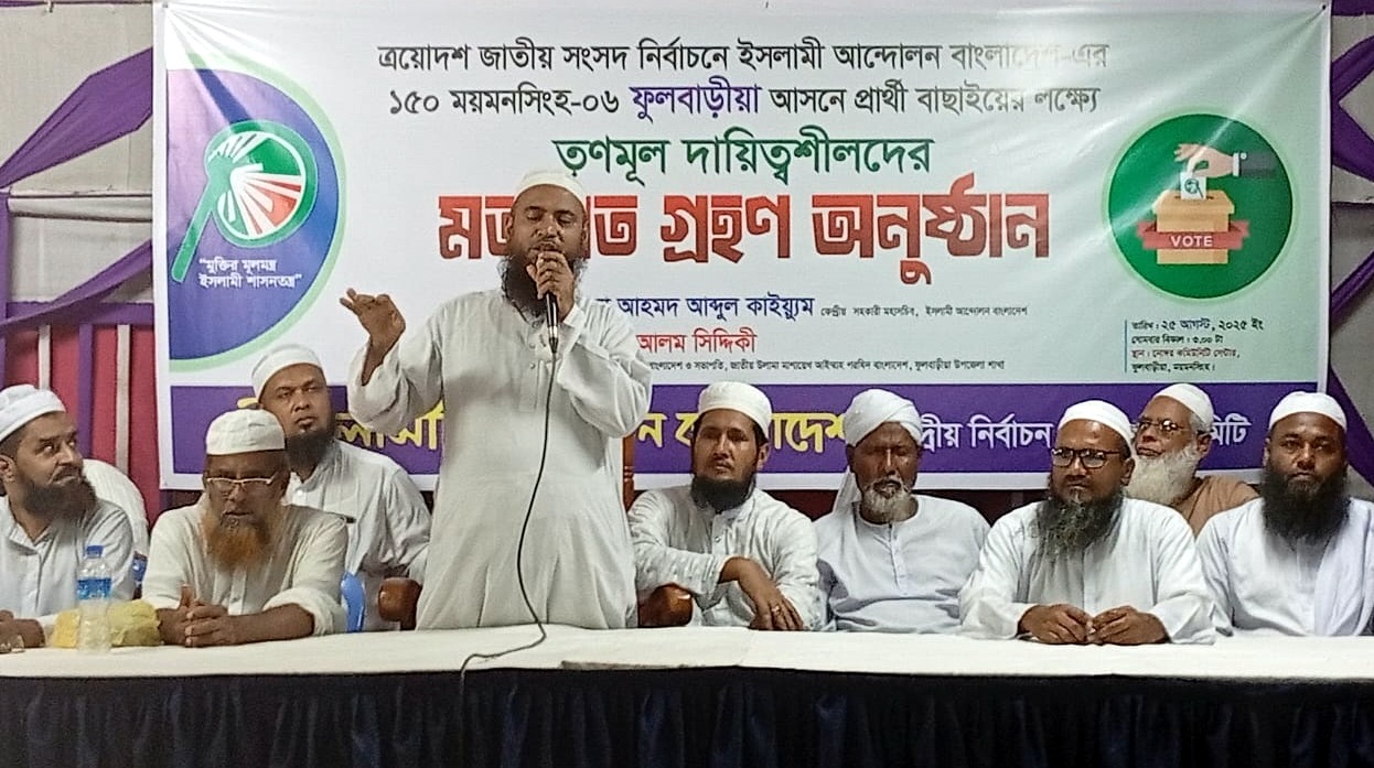 গতকাল বিকেলে ইসলামী আন্দোলন বাংলাদেশ ময়মনসিংহ-৬ (ফুলবাড়ীয়া) আসনে ত্রয়োদশ সংসদ নির্বাচনে প্রার্থী বাছাই অনুষ্ঠানে প্রধান অতিথির বক্তব্যে তিনি এসব কথা বলেন। জেলা নির্বাচন পরিচালনা কমিটির সভাপতি মাওলানা মামুনুর রশিদ সিদ্দিকীর সভাপতিত্বে এবং সেক্রেটারী মাসুদুর রহমানের সঞ্চালনায় এতে উপস্থিত ছিলেন জেলা সিনিয়ল সহ- সভাপতি মাওলানা সাইফুল্লাহ মানসুর, ওলামা মাশায়েখ আইম্ম পরিষদের জেলা সভাপতি মাওলানা তাজুল ইসলাম কাসেমী, শ্রমিকনেতা মনিরুরজ্জামানসহ জেলা ও থানানেতৃবৃন্দ।