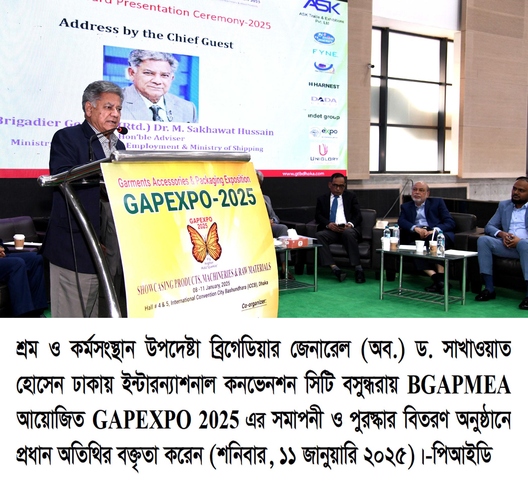 আজ ১১ জানুয়ারি শ্রম ও কর্মসংস্থান মন্ত্রণালয় এবং নৌপরিবহণ মন্ত্রণালয়ের দায়িত্বপ্রাপ্ত উপদেষ্টা ব্রিগেডিয়ার জেনারেল (অব.) ড. এম সাখাওয়াত হোসেন আজ রাজধানীর ইন্টারন্যাশনাল কনভেনশন সেন্টার বসুন্ধরায় বাংলাদেশ গার্মেন্টস অ্যাক্সেসরিজ এন্ড প্যাকেজিং ম্যানুফ্যাকচারার্স এন্ড এক্সপোর্টার্স অ্যাসোসিয়েশন (বিজিএপিএমইএ) আয়োজিত গ্যাপেক্সপো মেলার সমাপনী ও সম্মাননা প্রদান অনুষ্ঠানে প্রধান অতিথির বক্তৃতায় বাংলাদেশে গার্মেন্টস অ্যাক্সেসরিজ শিল্পে উৎপাদিত পণ্যেকে বিশ্ব মানের করার আহ্বান জানান।