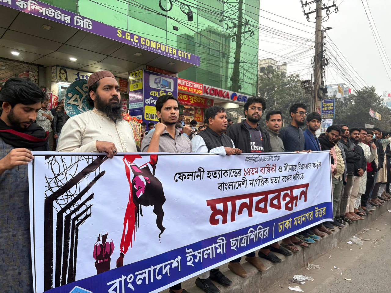মানববন্ধনে বক্তারা ১৪ বছর আগে সংগঠিত ফেলানী হত্যাকান্ডসহ ভারতীয় আগ্রাসনে নিহত সকল শহীদদদের বিচারের দাবী জানান। সাবেক কেন্দ্রীয় প্রচার সম্পাদক কামরুল হাসান বলেন, ভারত শুধু মুখে মুখেই বন্ধুত্বের দাবী করে। বাস্তবে বন্ধুত্বের উপহার হিসেবে ফেলানীর ঝুলন্ত লাশ উপহার দেয়।