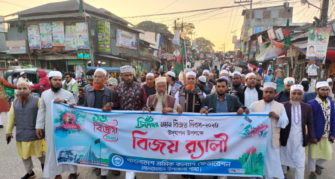 মহান বিজয় দিবস উপলক্ষে ভোলার লালমোহন উপজেলায় বর্ণাঢ্য বিজয় র্যাল করেছেন বাংলাদেশ শ্রমিক কল্যাণ ফেডারেশনের নেতৃবৃন্দ। সোমবার বিকেলে উপজেলা শ্রমিক কল্যাণ ফেডারেশনের উদ্যোগে লালমোহন ইসলামিয়া কামিল মাদরাসা মাঠ থেকে একটি বর্ণাঢ্য র্যালি বের হয়ে পৌরশহরের প্রধান প্রধান সড়ক প্রদক্ষিণ করে চৌরাস্তার মোড়ে গিয়ে শেষ হয়। পরে সেখানে পথসভা অনুষ্ঠিত হয়।