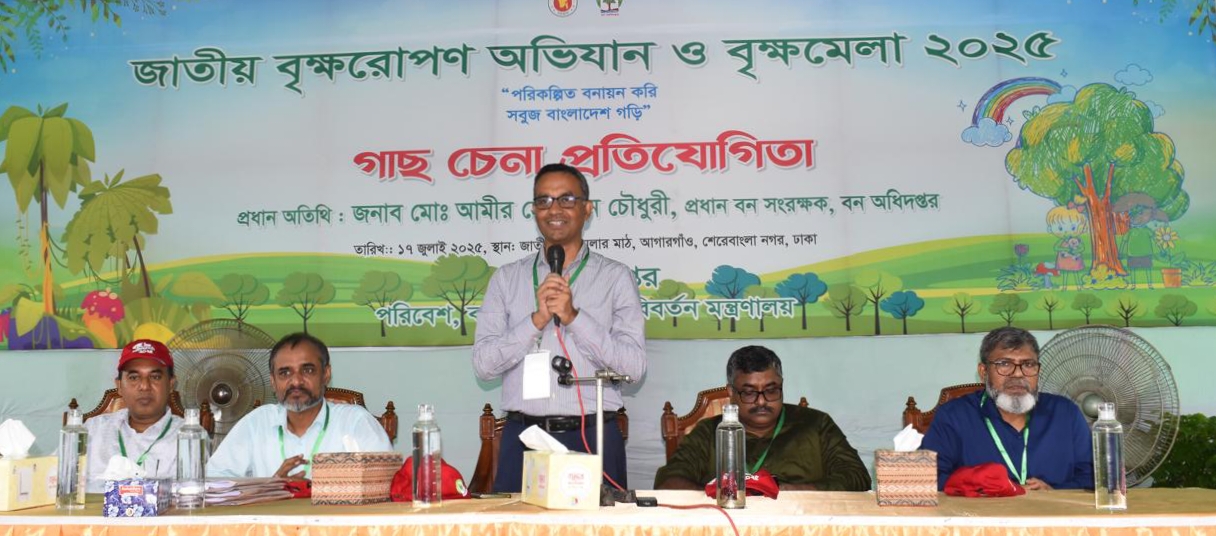জাতীয় বৃক্ষরোপণ অভিযান ও বৃক্ষমেলা ২০২৫ উপলক্ষ্যে গাছ ও পরিবেশ সম্পর্কে শিক্ষার্থীদের মাঝে সচেতনতা সৃষ্টির লক্ষ্যে ১৭ জুলাই ২০২৫ সকালে জাতীয় বৃক্ষমেলা প্রাঙ্গণে আয়োজিত হয় ‘গাছ চেনা প্রতিযোগিতা ২০২৫’। প্রধান বন সংরক্ষক মোঃ আমীর হোসাইন চৌধুরী প্রতিযোগিতায় প্রধান অতিথি হিসেবে উপস্থিত থেকে আনুষ্ঠানিক উদ্বোধন করেন। অনুষ্ঠানে বন অধিদপ্তরের উর্ধ্বতন কর্মকর্তাগণ উপস্থিত ছিলেন।