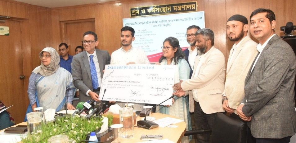 আজ রোববার শ্রম ও কর্মসংস্থান মন্ত্রণালয়ের উপদেষ্টা আসিফ মাহমুদ সজীব ভূঁইয়ার কাছে গ্রামীণফোনের প্রতিনিধি দল এই চেক হস্তান্তর করেন।