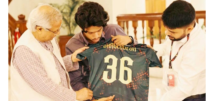 নিহত সাংবাদিক দম্পতি সাগর সরওয়ার ও মেহেরুন রুনির সন্তান মাহির সরওয়ার মেঘ প্রধান উপদেষ্টা ড. মুহাম্মদ ইউনূসকে নিজের ডিজাইন করা একটি জার্সি ও ব্যাগ উপহার দিয়েছেন।