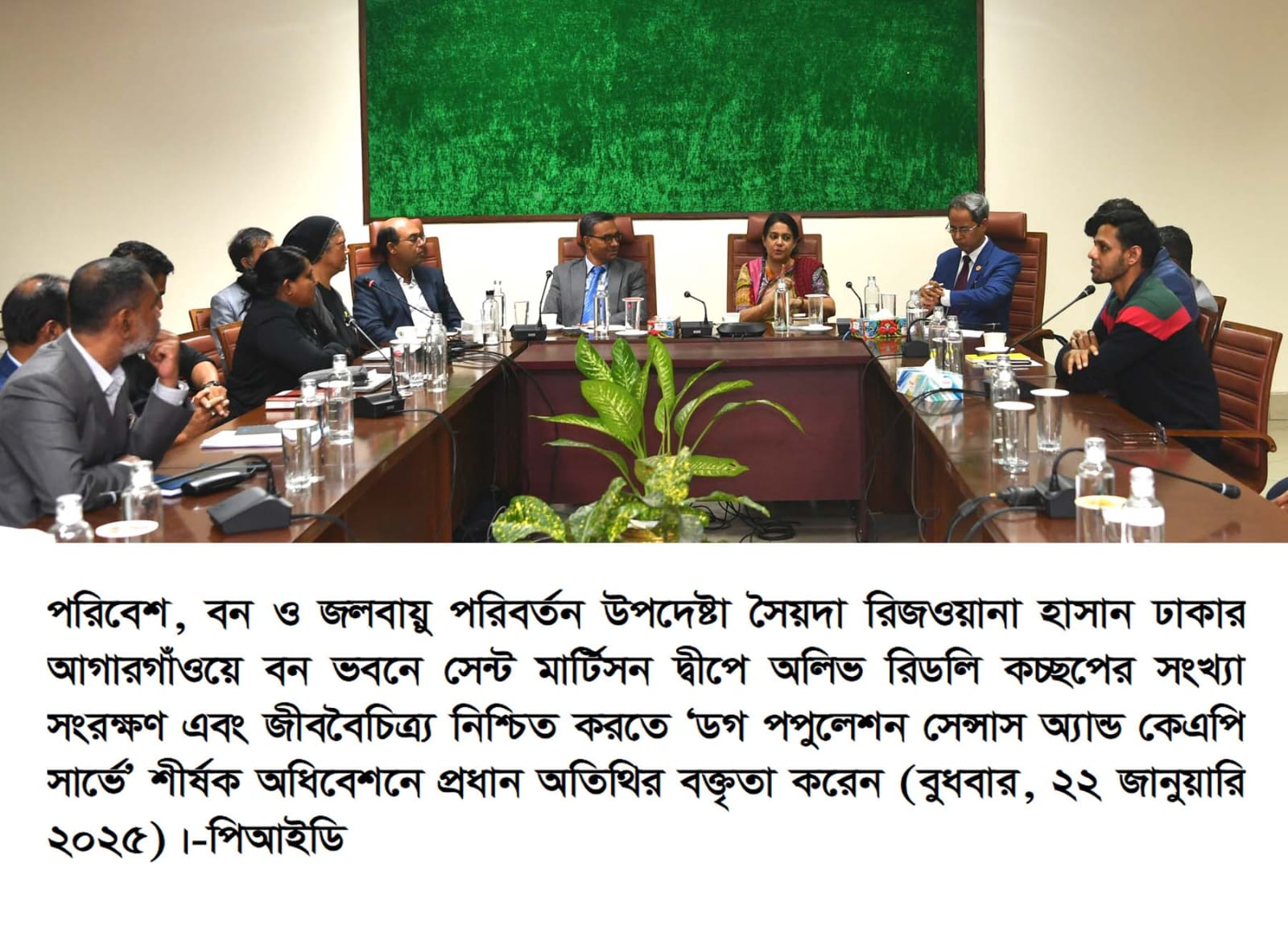 বুধবার রাজধানীর আগারগাঁওয়ের বন ভবনে “সেন্ট মার্টিন দ্বীপে কুকুরের সংখ্যা গণনা ও সচেতনতা জরিপ: অলিভ রিডলি কচ্ছপ সংরক্ষণ এবং জীববৈচিত্র্য নিশ্চিতকরণ” শীর্ষক সেশনে প্রধান অতিথির বক্তব্যে তিনি এ কথা বলেন।
