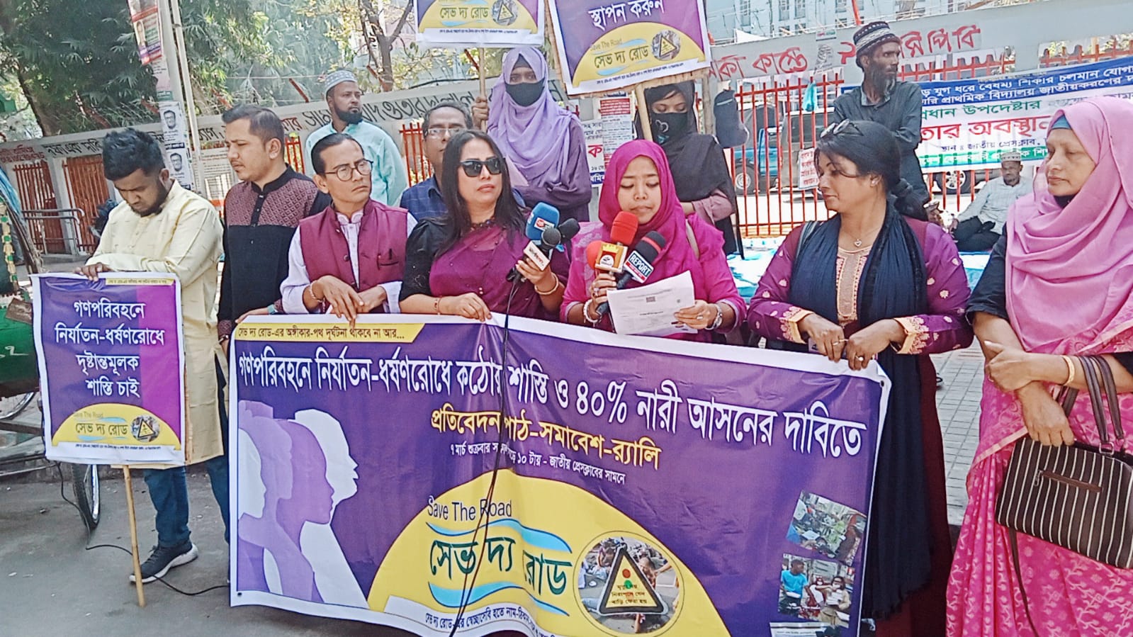 আজ ০৭ মার্চ বেলা সাড়ে ১০ টায় জাতীয় প্রেসক্লাবের সামনে অনুষ্ঠিত কর্মসূচিতে লিখিত প্রতিবেদনে তিনি আরো জানান, গত ১ বছরে রেলপথে ৫৬২ টি নির্যাতন, ১১ টি ধর্ষণ; সড়কপথে ৪১৩ টি নির্যাতন ও ২০ টি ধর্ষণ; নৌপথে ৩২৫ টি নির্যাতন ও ৫ টি ধর্ষণ এবং রেল-নৌ-বাস স্টেশন ও ফুটপাতে ৪৫৮ টি নির্যাতন ও ৫ টি ধর্ষণের ঘটনা ঘটেছে। সেভ দ্য রোড-এর প্রতিষ্ঠাতা মোমিন মেহেদীর সভাপতিত্বে এতে বক্তব্য রাখেন সেভ দ্য রোড-এর ভাইস চেয়ারম্যান সোনিয়া দেওয়ান প্রীতি, সদস্য ওয়াজেদ রানা, কন্ঠশিল্পী রিয়া খান, রিয়াদ ইসলাম, কাজী মুন্নী আলম, মেহেদী হাসান, মোনালিসা দেওয়ান অশ্রু প্রমুখ।