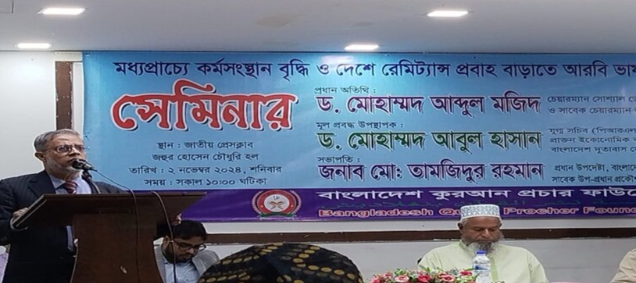 শনিবার (২ নভেম্বর) সকালে জাতীয় প্রেসক্লাবে বাংলাদেশ কুরআন প্রচার ফাউন্ডেশনের উদ্যোগে “মধ্যপ্রাচ্য কর্মসংস্থান বৃদ্ধি ও দেশে রেমিট্যান্স প্রবাহ বাড়ানো অপরিহার্য” শীর্ষক সেমিনারে প্রধান অতিথির বক্তব্যে তিনি একথা বলেন।