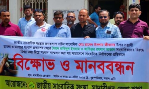 সারাদেশে সাংবাদিকদের হামলা মামলার প্রতিবাদে মাদারীপুরে জাতীয় সাংবাদিক সংস্থার উদ্যোগে বিক্ষোভ ও মানববন্ধন
